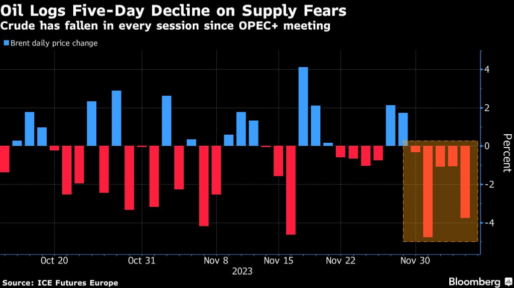 Nafta je zadržala veći dio petodnevnog niza gubitaka koji je cijene doveo do najnižih vrijednosti od lipnja, zbog znakova da globalne zalihe premašuju potražnju, unatoč planovima OPEC±a da do 2024. godine smanji proizvodnju.